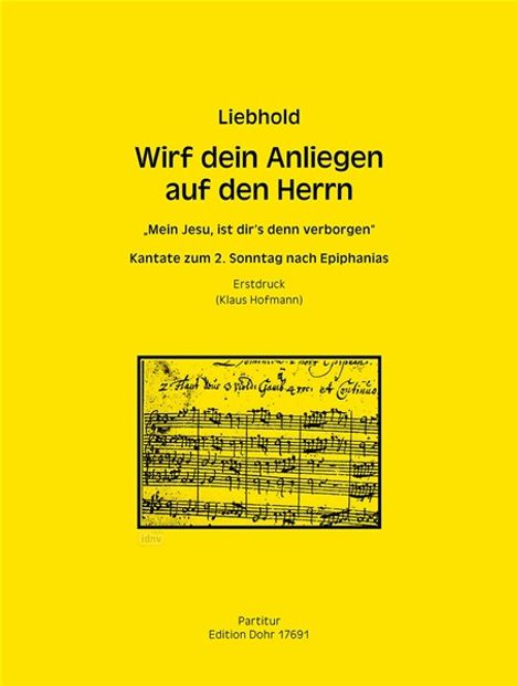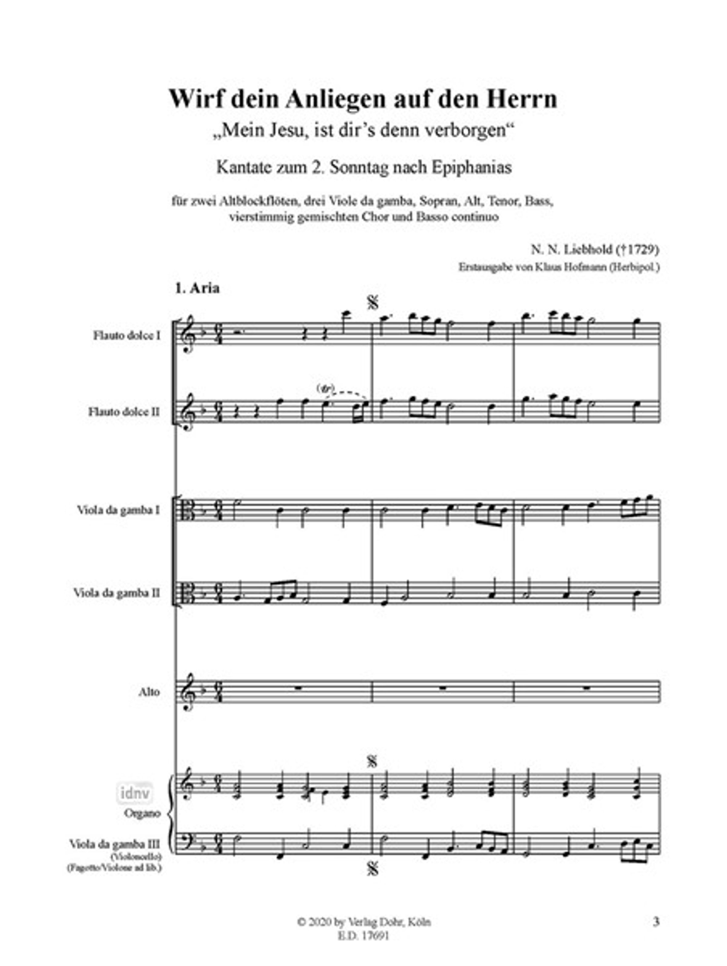 Liebhold: Wirf dein Anliegen auf den Herrn für zwei Altblockflöten, drei Viole da gamba, Sopran, Alt, Tenor,...