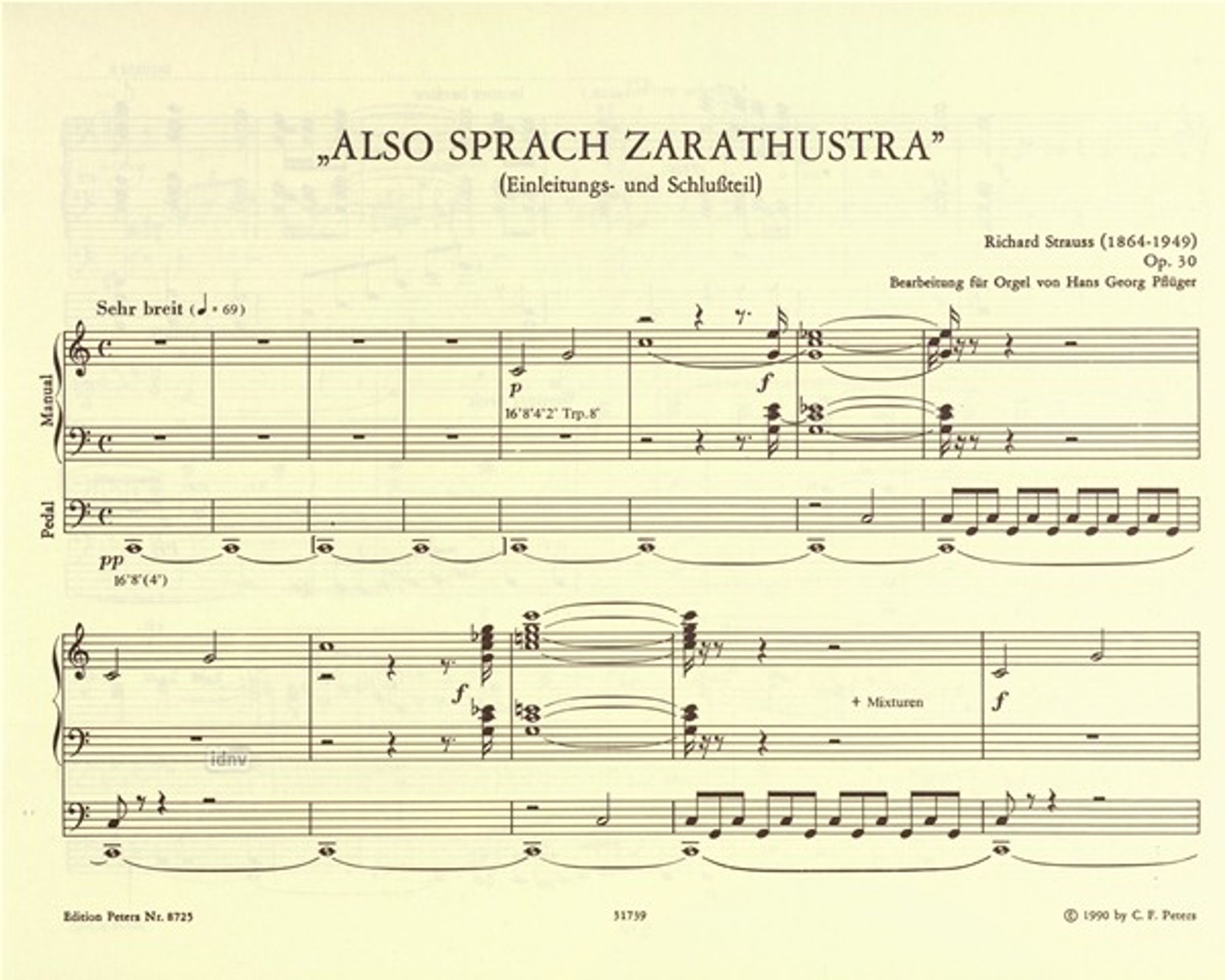 Strauss' Also sprach Zarathustra Op. 30, opening & conclusion, arranged for organ by Hans Georg Pfluger.