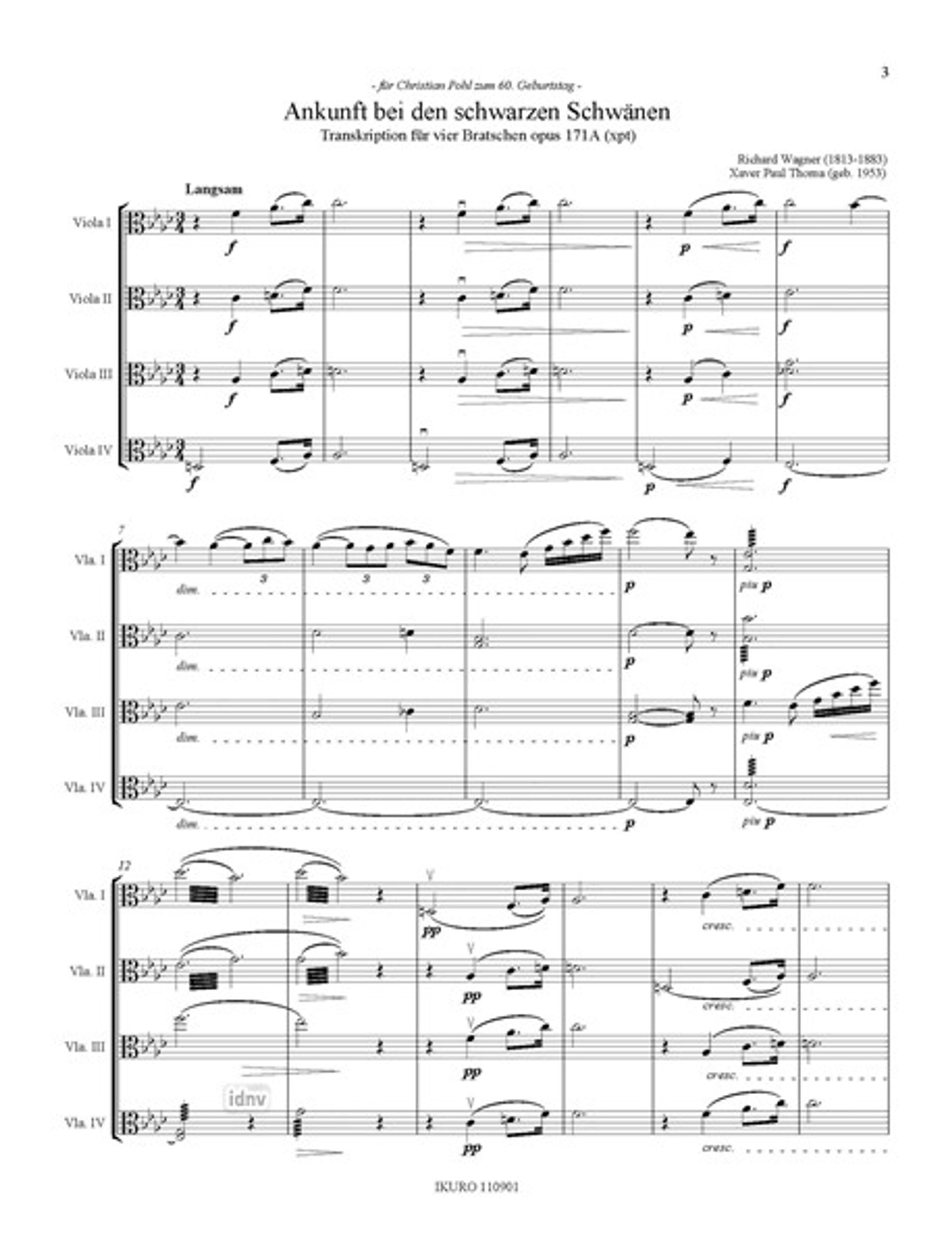 "Ankunft bei den schwarzen Schwänen" von Richard Wagner und Xaver Paul Thoma, Transkription für 4 Bratschen. Ikuro Edition Logo unten., Noten