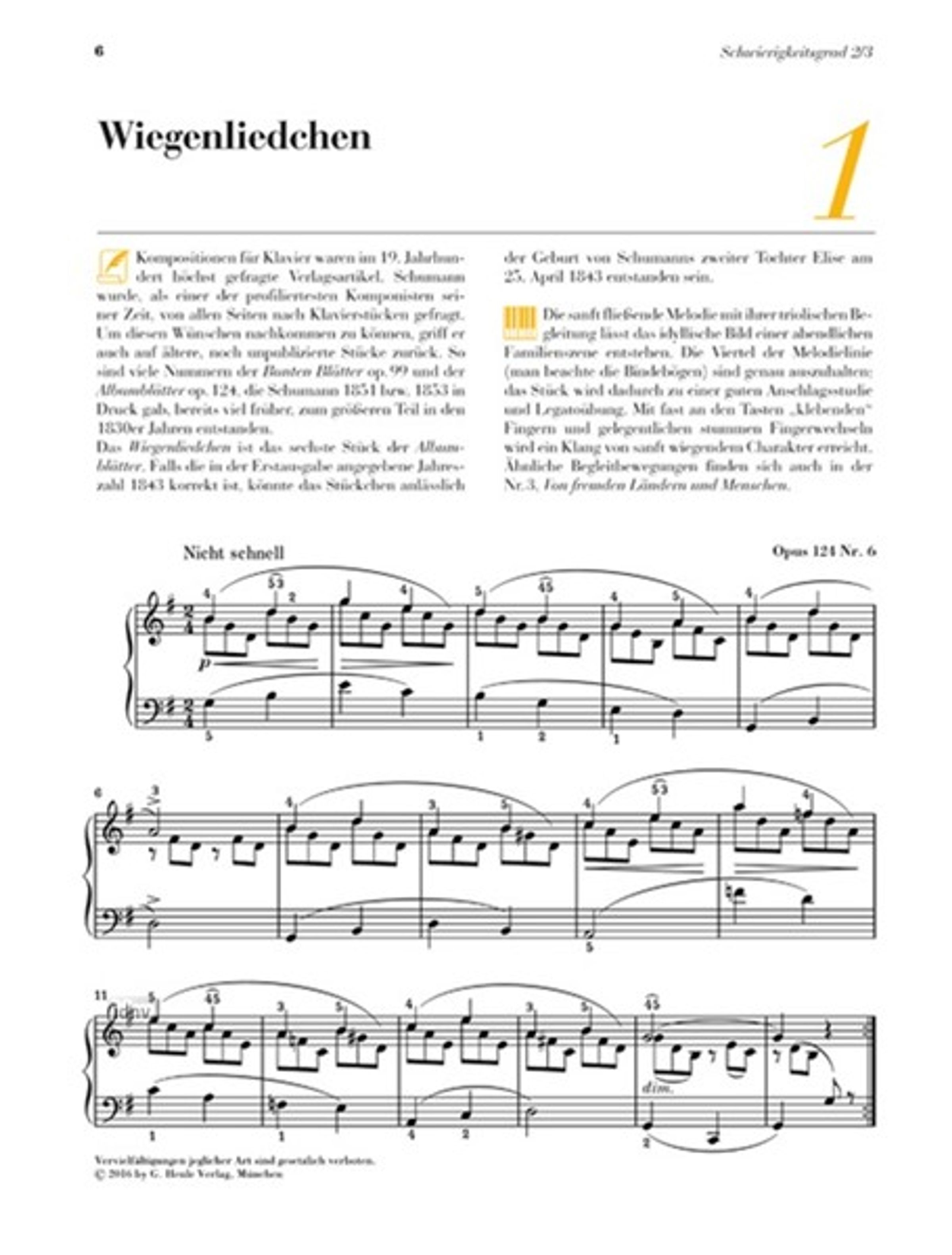 Für den Wiedereinstieg am Klavier, in aufsteigender Schwierigkeit von leicht bis mittelschwer, mit Fingersatz und praktischen Hinweisen zu Technik und InterpretationAnmerkungen: