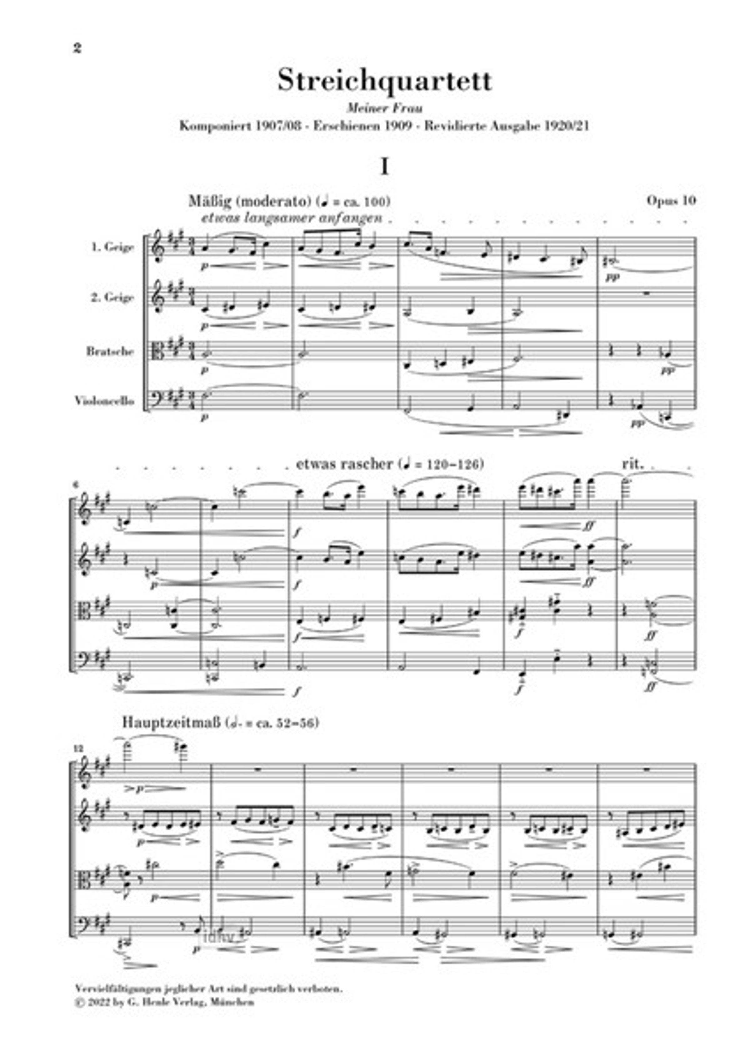 Das 1907 / 08 entstandene Kammermusikwerk markiert eine Zäsur nicht nur im Schaffen Schönbergs, sondern für die moderne Musikgeschichte überhaupt. Die über Jahrhunderte hinweg verbindliche Dur-Moll-Tonalität wird im Verlauf der vier Sätze immer stärker zugunsten einer freien Atonalität aufgegeben. Dieser Bruch mit der musikhistorischen Tradition geht einher mit einem weiteren Verstoß gegen die Konvention, indem Schönberg in den letzten beiden Sätzen eine Sopranstimme mit der Vertonung von zwei Gedichten Stefan Georges auftreten lässt. Mit dem Übergang zur Atonalität öffnete Schönberg den Weg zu einer neuen Tonsprache, die wenig später zur Zwölftonmusik führen sollte. Keine Frage: Sein zweites Streichquartett stellt einen Wegweiser in der Musikgeschichte dar. Herausgegeben wird die Henle-Neuedition vom Schönberg-Spezialisten Ullrich Scheideler auf dem aktuellen Stand der Forschung. Die Henle-Urtextausgabe legt diesen Klassiker der Moderne im neuen, großzügig angelegten Notensatz vor.