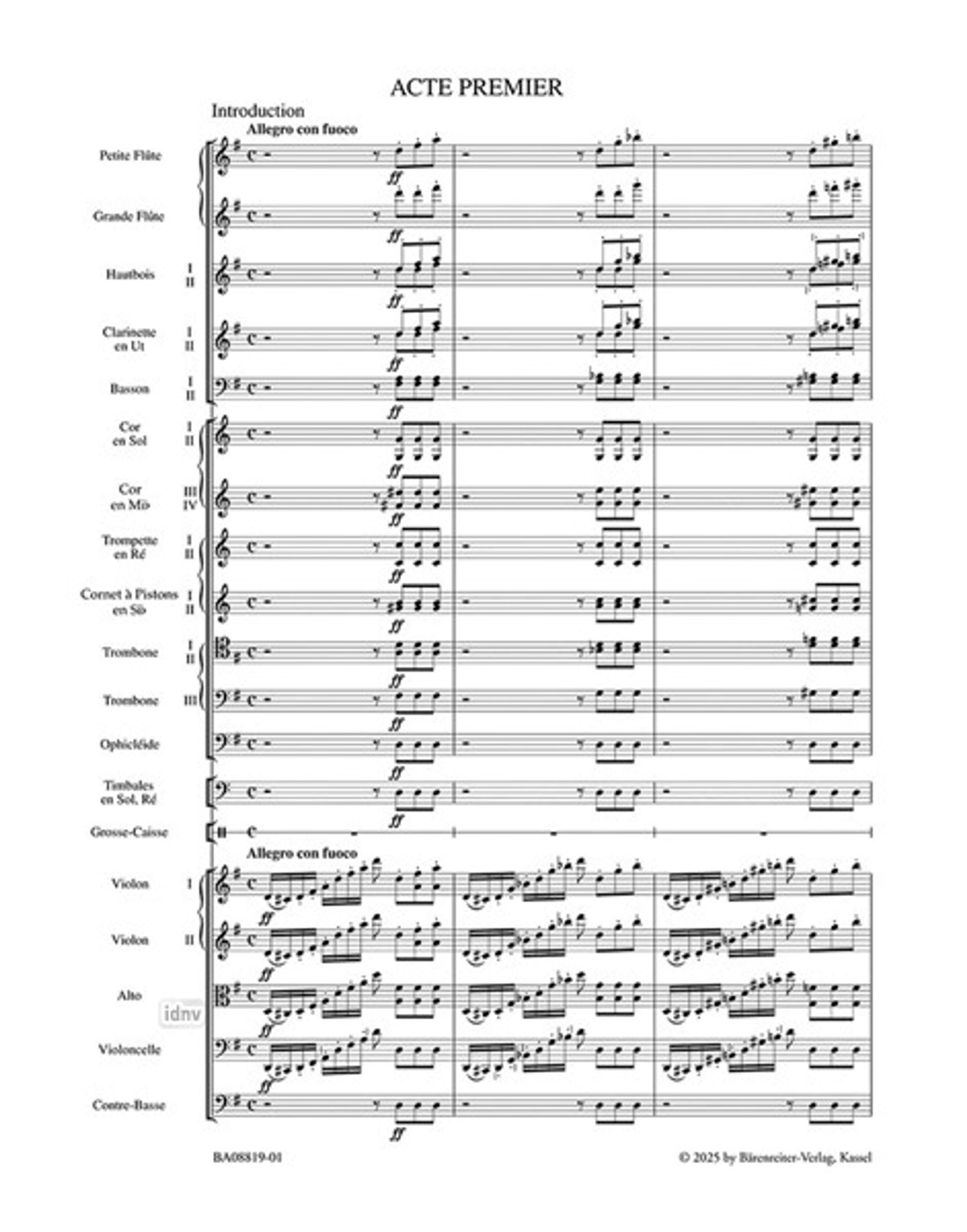 - Ballett, Piccoloflöte, Flöten (2), Oboen (2), Englischhorn (2), Klarinetten (2), Fagotte (2), Hörner (4), Trompeten (2), Kornett (2), Posaunen (3), Ophikleide,