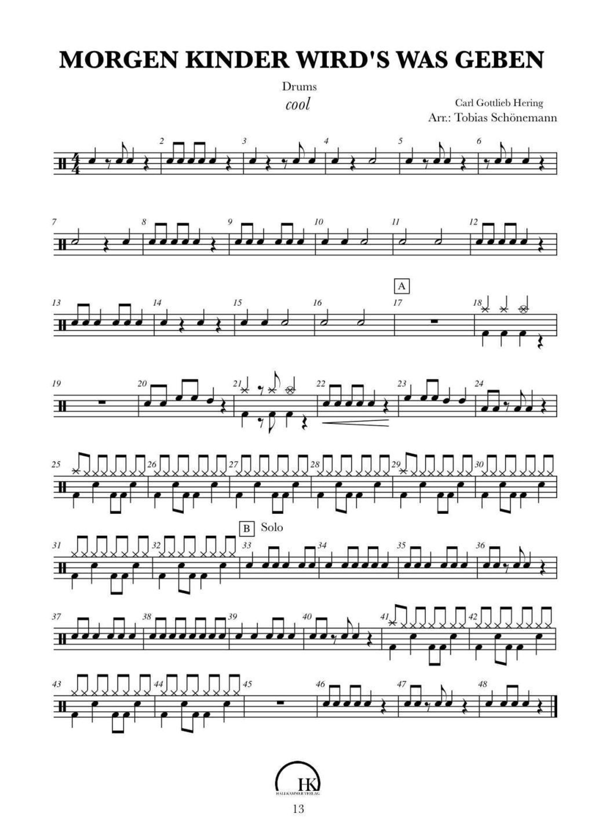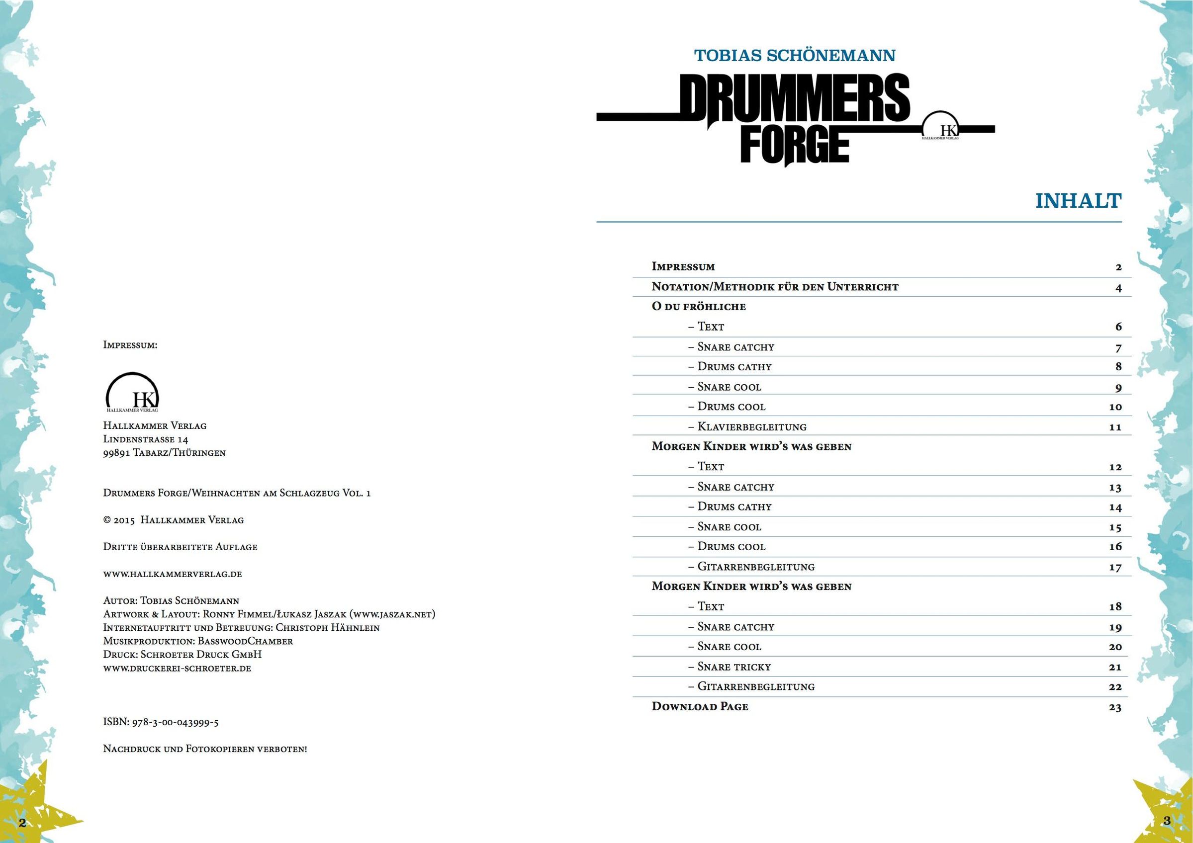 Der Hallkammer Verlag präsentiert hier ein Buch für Schlagzeug und Snaredrum, welches speziell für die Weihnachtszeit konzipiert wurde. Es handelt sich um drei bekannte Weihnachtslieder: "O Du Fröhliche", "Morgen Kinder wird's was geben" und "Mary's Boy Child". Für Anfänger bis Fortgeschrittene gleichermaßen geeignet, denn die Lieder sind in zwei bzw. drei Schwierigkeitsstufen notiert. Es handelt sich um Arrangements für Snaredrum und Schlagzeug. Die Playalongs, welche zum freien Download enthalten sind, gibt es in drei Geschwindigkeitsstufen (langsam, mittel, Schnell), sodass die Lieder Schritt für Schritt und ohne Stress erlernt werden können. Um das gemeinsame Musizieren zu fördern, gibt es außer der Arrangements auch eine Begleitung für Klavier bzw. für Gitarre. Beides ist einfach gesetzt, damit man von Anfang an mitspielen kann. So kann man Pianisten, Gitarristen und Schlagzeuger gemeinsam Musik erleben lassen. Der Autor hat dem Heft einige praktische Tipps zum erarbeiten beigelegt, also steht einem erfolgreichen Weihnachtsabend am Schlagzeug nichts im Weg!