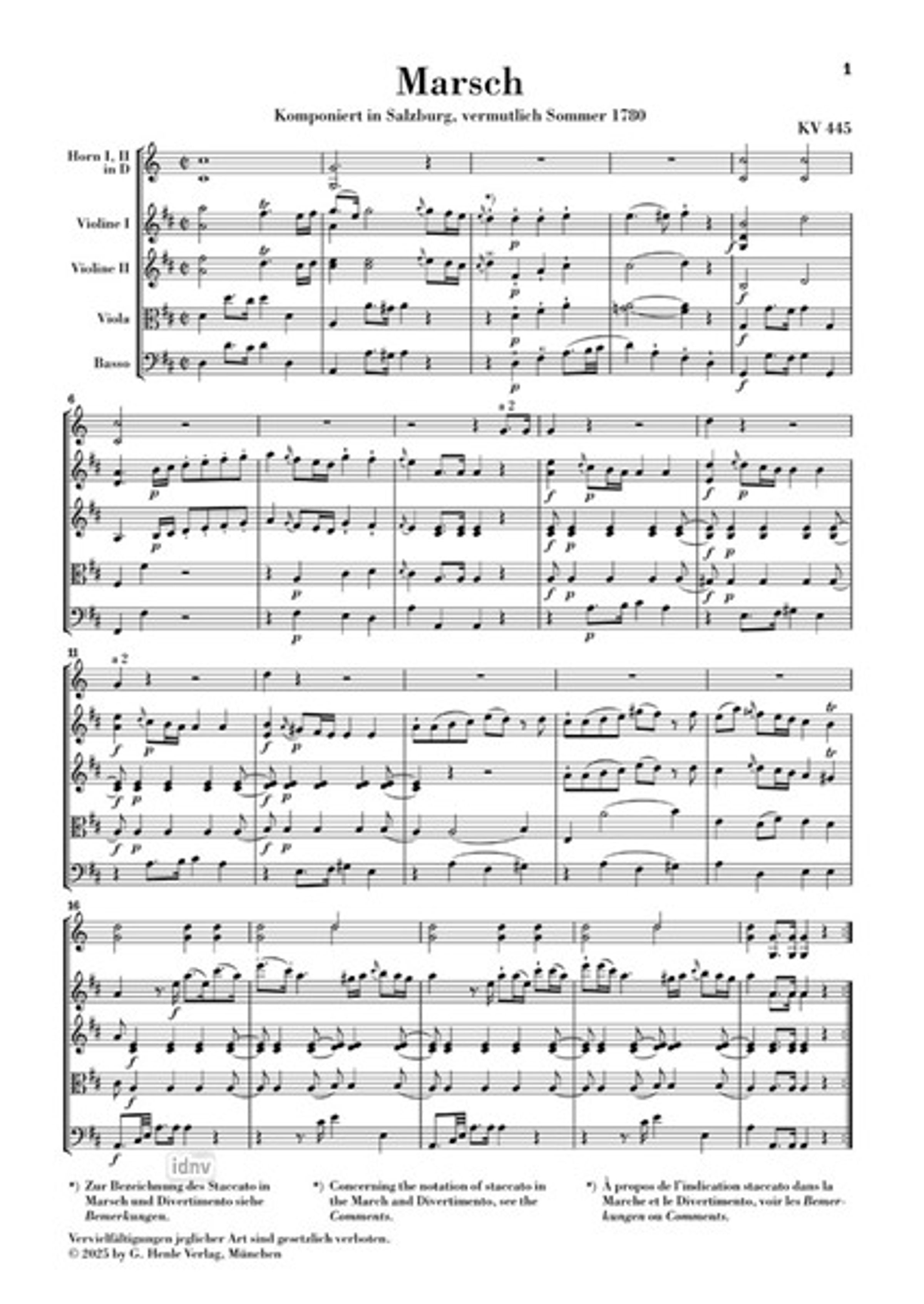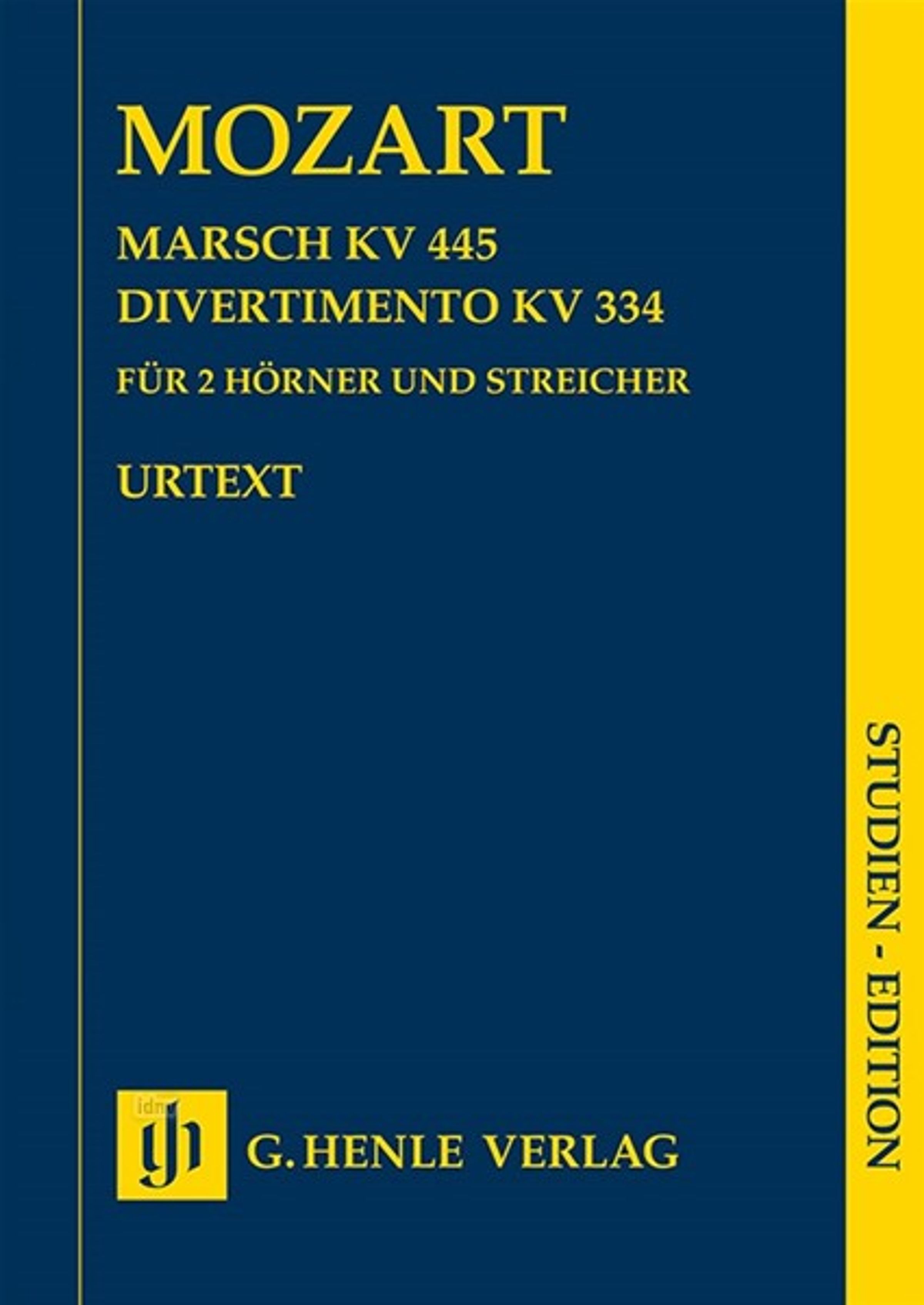 Mozart: Marsch KV 445, Divertimento KV 334. Für 2 Hörner und Streicher. Urtext. Studien-Edition. G. Henle Verlag., Noten