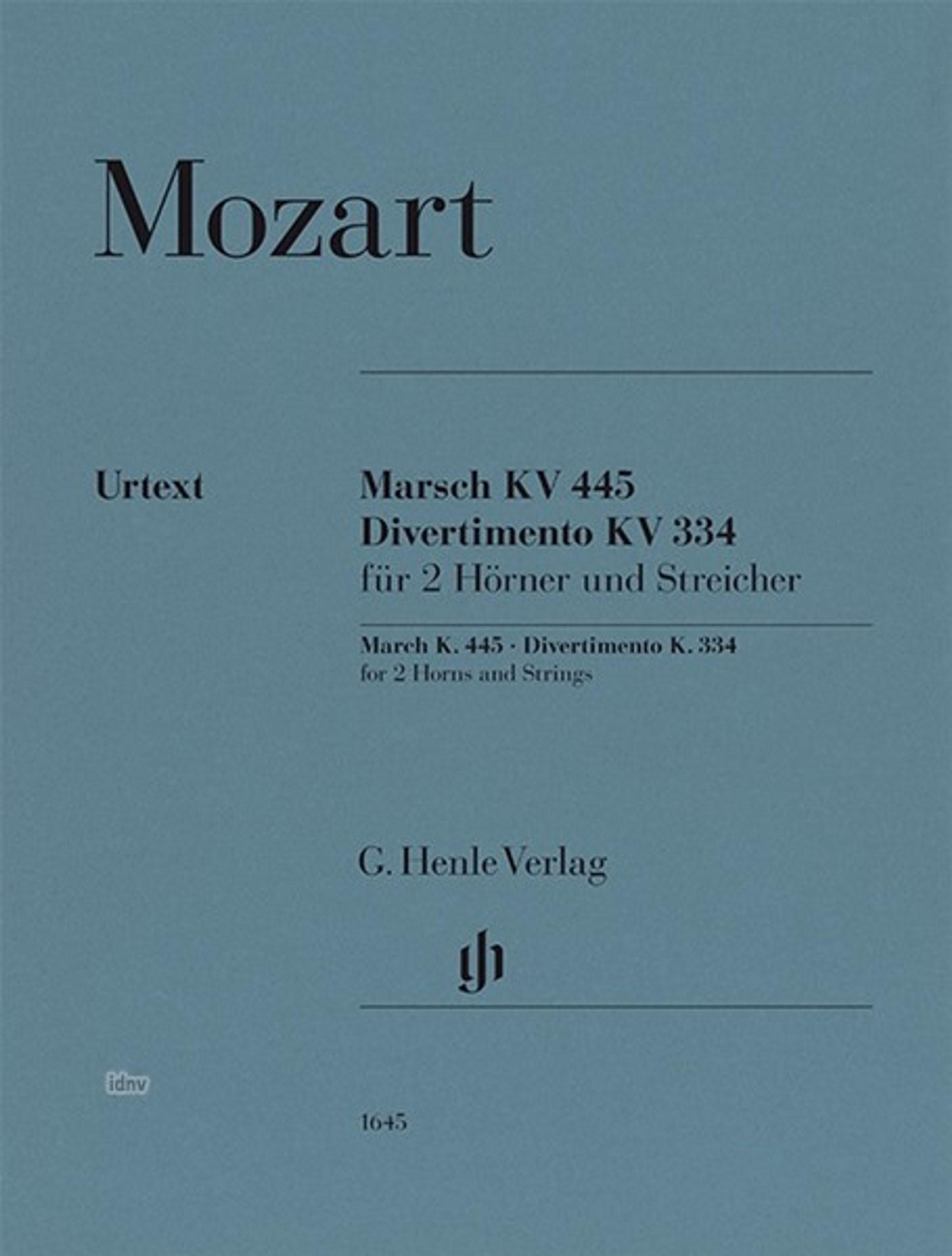 Mozart, Marsch KV 445, Divertimento KV 334, für 2 Hörner und Streicher. G. Henle Verlag. Blauer Hintergrund., Noten