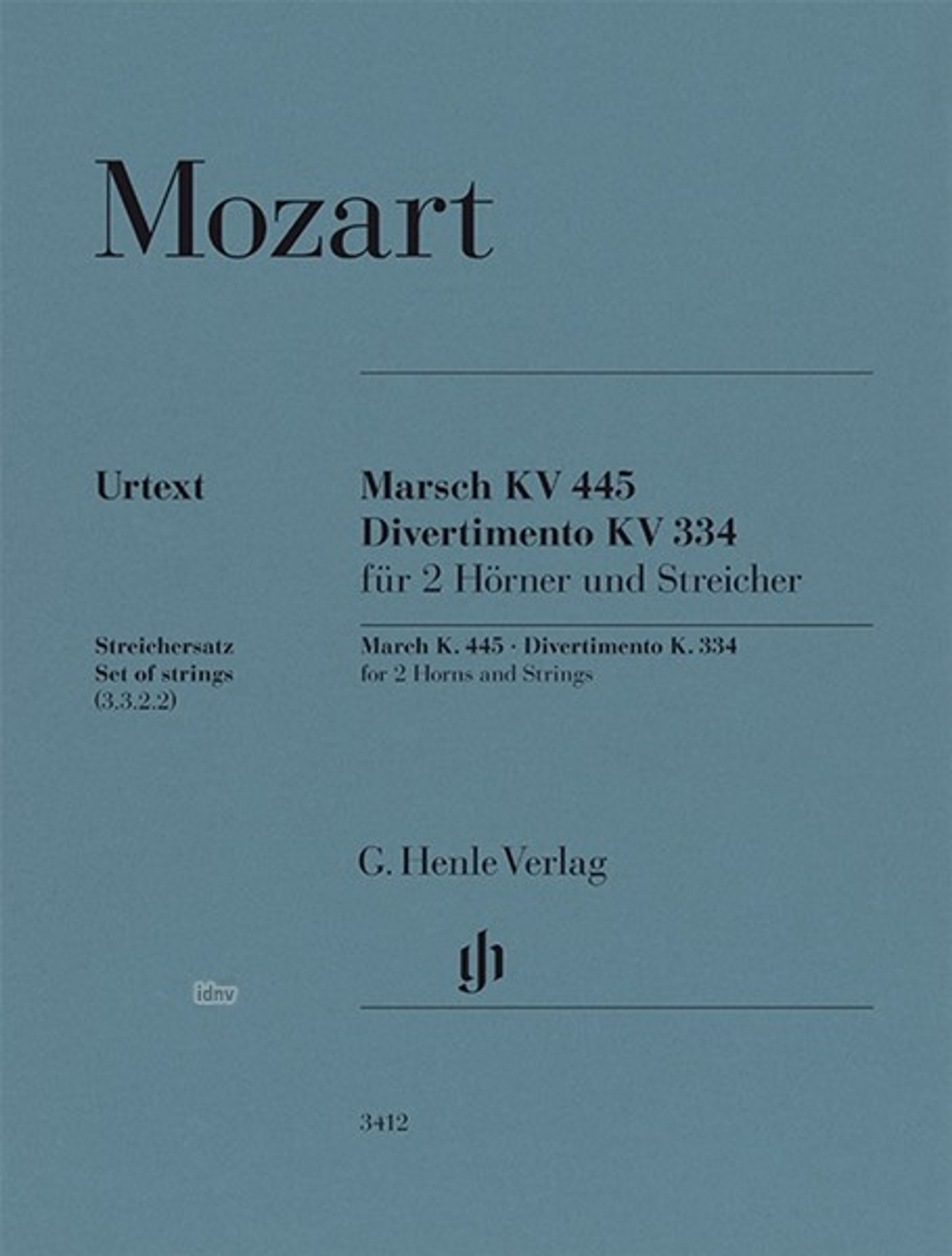 Mozart, Marsch KV 445, Divertimento KV 334 für 2 Hörner und Streicher. G. Henle Verlag. Blaues Cover mit elegantem Design., Noten