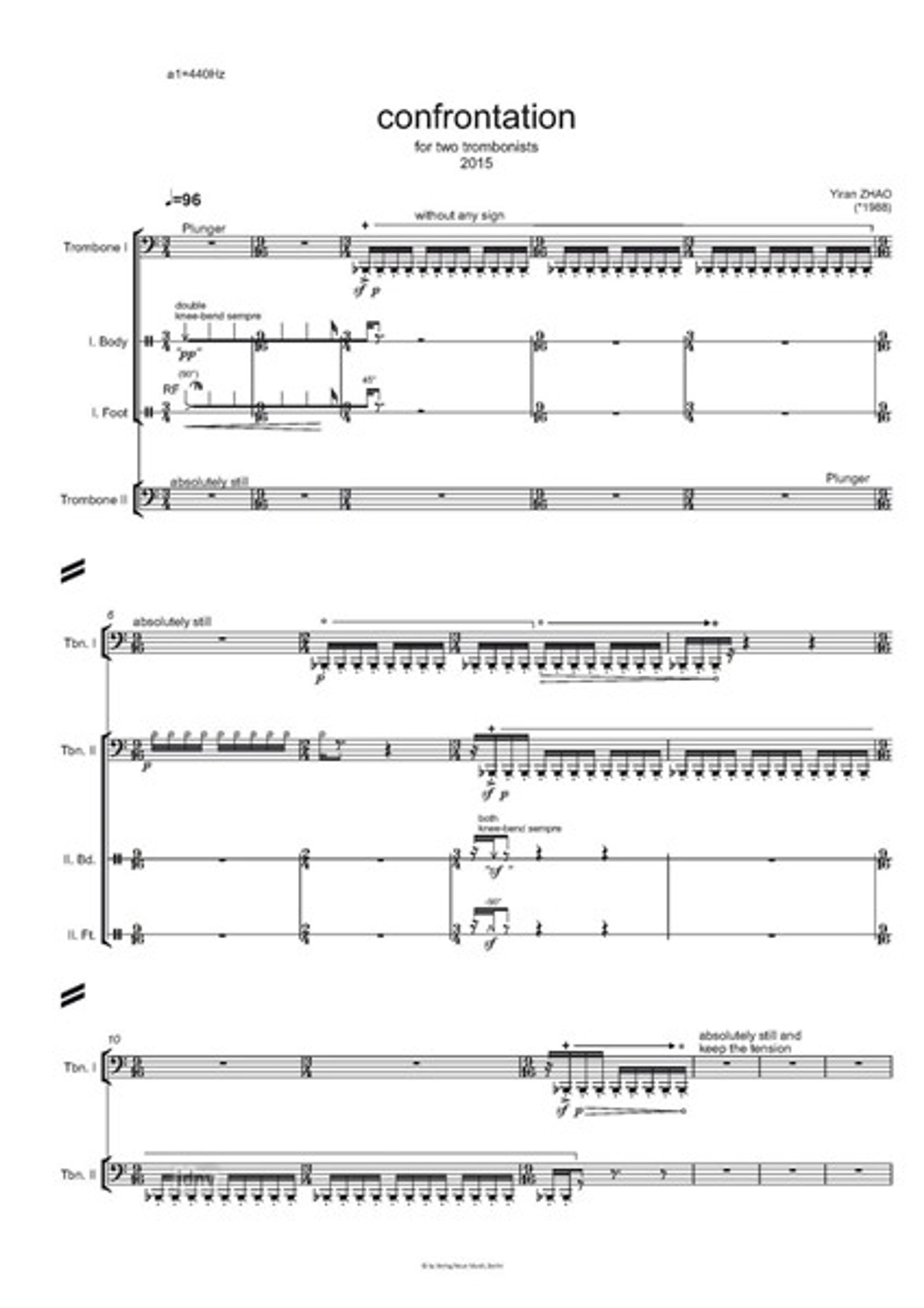 Yiran Zhao: Confrontation für zwei Posaunen (2015), Noten, Noten